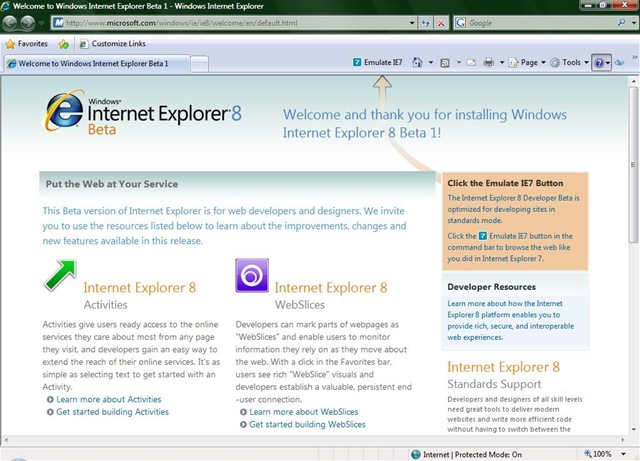 Once you have completed the settings wizard you are prompted with the new IE8 Welcome Page, introducing you to the new features available such as IE7 Emulation mode and WebSlices.